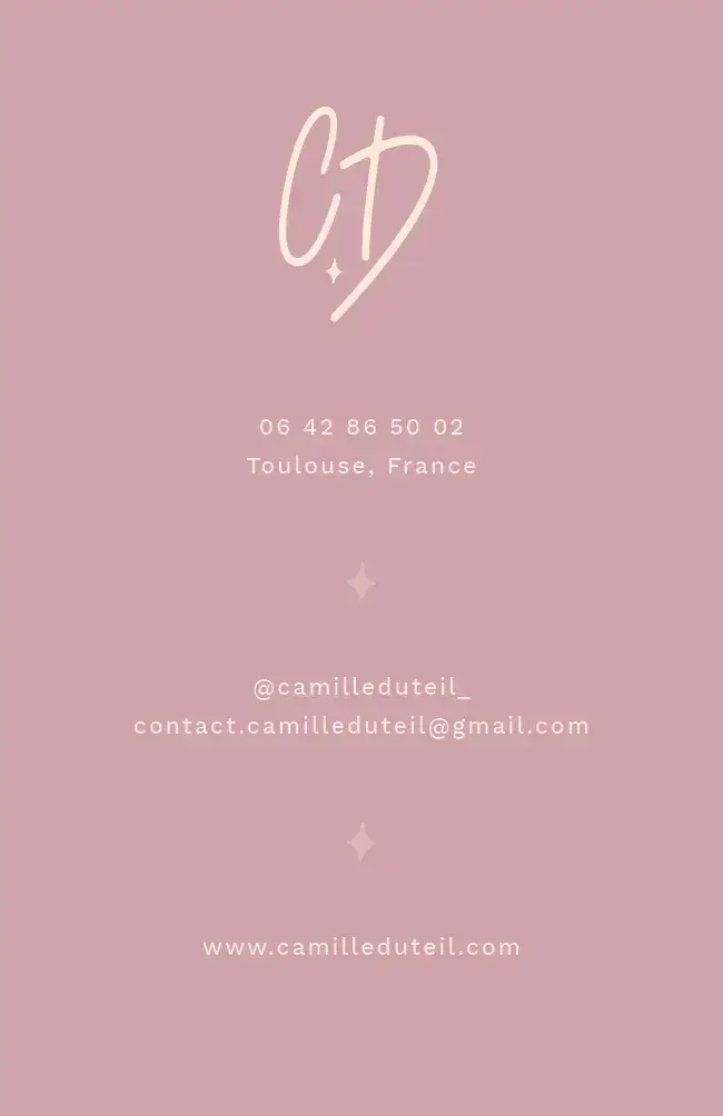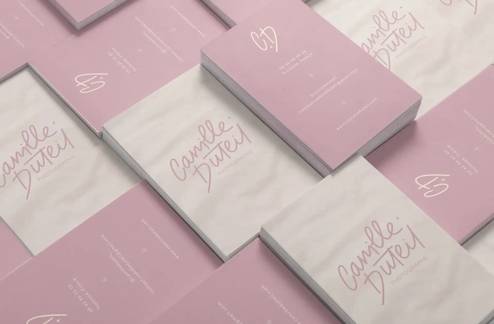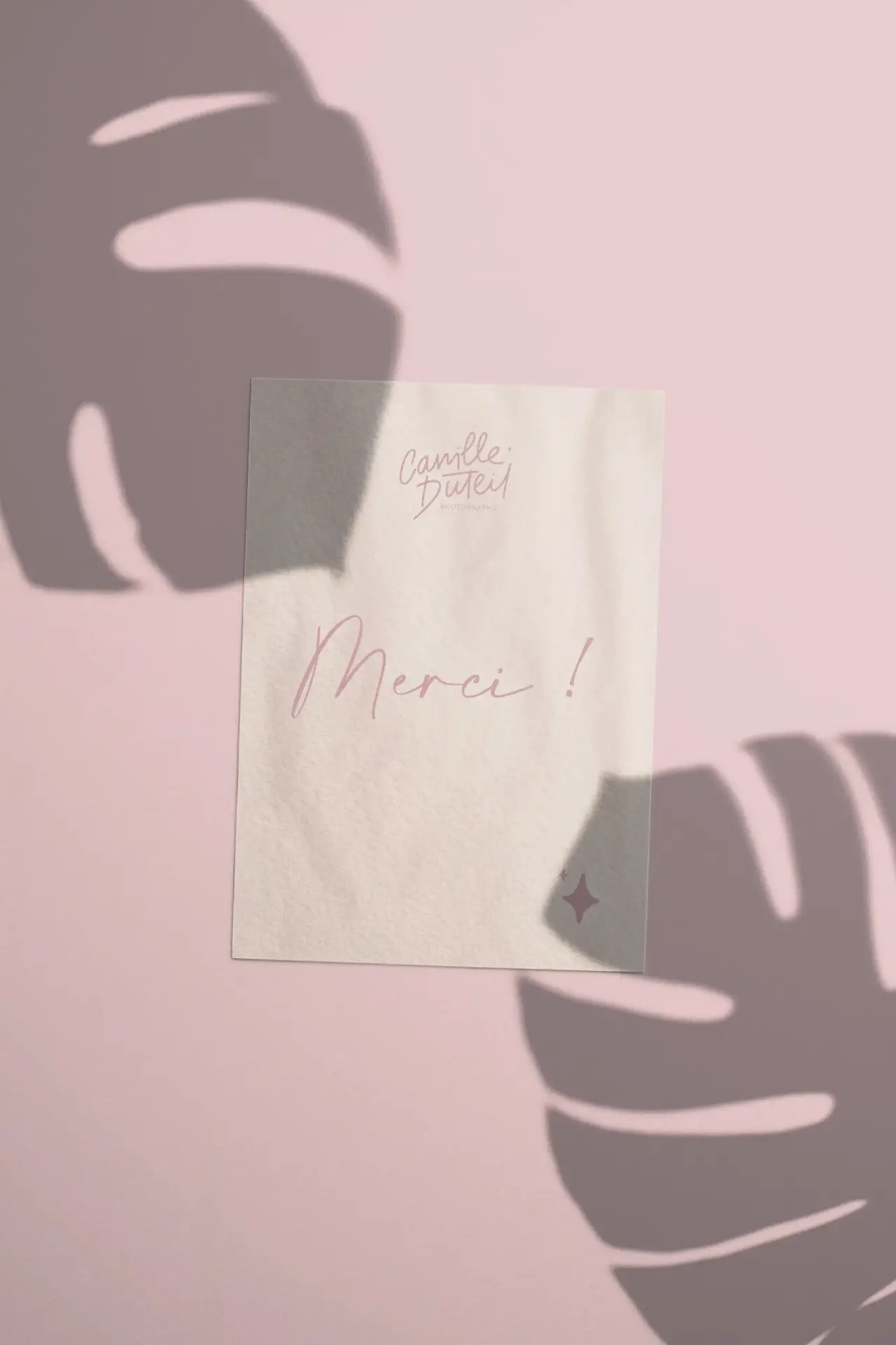 J’ai réalisé différents design pour Camille. Nous avons réalisé ensemble le design de ses nouvelles cartes de visite. Mais également des cartes de remerciements et des cartes bon cadeau.